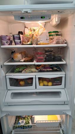 KENMORE refrigerator, fully working+extra clean (see pics). French two-door plus extra freezer. Separate temperature controls for freezer+fridge. Comes with a connection to filtered water dispenser....