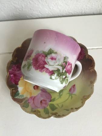 Collectible shabby chic antique dishes. There’s one flow blue small scalloped embossed saucer with gold highlights;one pale yellow floral scalloped saucer; 1 small blue floral and scenery plate by Wedgewood &CO. England and one small floral cup and floral plate. The small floral cup is marked but hard to see where it was made as stamp is faded. Floral plate has had a small repair. Great for the collector! Buy the lot or pick which one you want.