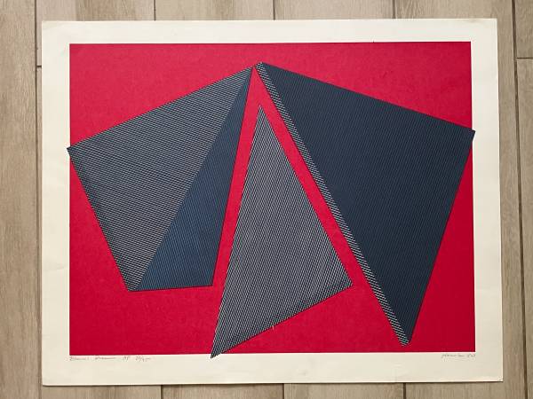 Both are in very good condition, having never been framed. There is minor storage wear and a small 1/4" closed tear on the edge of the red-hued piece which will be hidden once matted and framed. Minor marks to the white space.