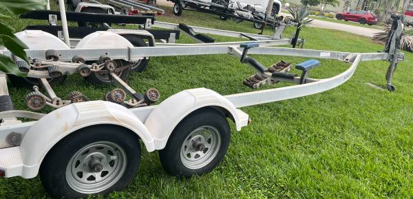 Galvanized dual axels trailer up to 27’ boat or 10000lb. Registration. Brakes. New lights, new wires. Good 14’ wheels, All other components are in working order. Ready to load…