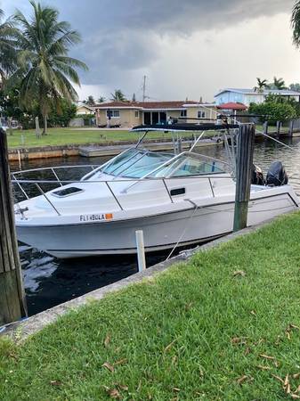 Robalo 2640 walk around, some from the old days would call it a cuddy cabin even though you certainly can walk around the cabin or go thru the front hatch to get to the front of the boat. It is a 1999 hull with twin 2007 Suzuki 175 4 stroke outboards, these engines are sweet, only about 350 hrs on each. When I bought the boat I had a mechanic do a diagnostic test on them ( I have the written reports for your examination) at that time they had 314 hrs of which less than 1 hour was over 2000 rpm, the bulk of the hrs was between 1000-2000 rpm so it obviously was a canal cruiser. If you spend time offshore twins engine is the way to go even just Bimini brings you into open ocean so the second engine is a great safety feature. The boat tops out around 40mph and if you are trolling you can run on one engine to save fuel and service time.The bunk in the front is great if you want to get the kids out of the sun or do an overnite in the bay. She has a small but fully functional bathroom with a shower so you can overnite multiple nights without becoming gross.She has fancy outriggers and live bait well(I've never used them),a large seat across the stern plus 2 capt chairs with sitting areas behind them. She has a full aluminum framed top which keeps the captain out of the sun and weather.Typical instruments GPS chartplotter,compass, vhf and digital lights in the cabin and cockpit. It has a nice stereo but we usually just used pandora. I replaced the batteries with high amp units a year ago and the bottom paint is good. She comes with a trailer which fits her perfectly has had recent springs and the tires and axles have very little wear, it is a 10,000 lb trailer which is more than she needs.