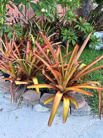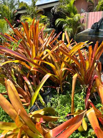 Giant orange red bromeliad, the plants are 24 inches high and very healthy. The flowers are bright red and orange on a shoot, coming out of the plant. They are beautiful and the flowers last quite a while. the plant grows great in bright sun. The more sun thy get the brighter orange red they get. I have many to choose from. Call or text only please. I do not go into voice mails or mails, Thank you show contact info