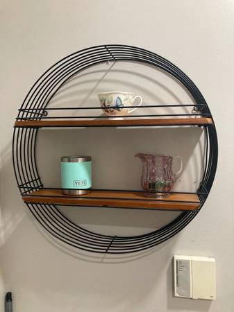 Circular/round metal wall shelf with wooden planks.