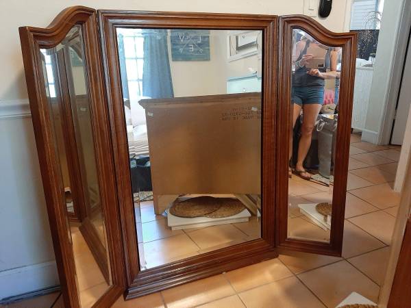 Beveled Classic Real wood design w hidden jewelry case. No one would know. It's awsome Heavy. Needs 2 people to move 4 1/2 feet tall 3 1/2 wide appx. Can get exact measurements when I receive inquiry