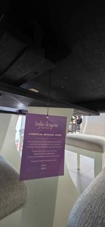 Beautiful Sofia Vergara Collection dining table set with 6 upholstered chairs and the original 18-inch leaf extender. Photos show the table without the leaf installed, but the leaf is included and in great condition.