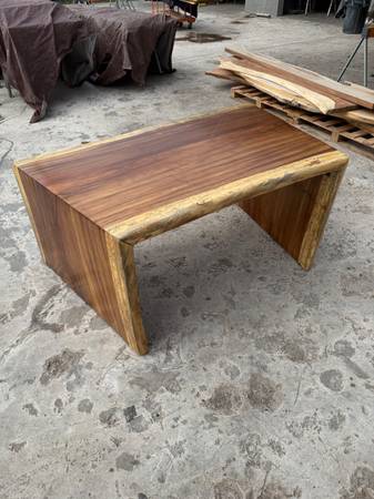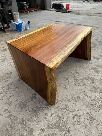 Bring natural beauty into your home or office with this stunning Monkey Pod double waterfall desk. Crafted from a single live edge slab, the continuous grain flows seamlessly down both sides, creating a bold and modern waterfall effect.