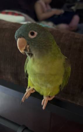 He may respond if you call his name or speak gently. Please check trees, rooftops, balconies, fences, and bushes, and listen for parrot sounds. He may be quiet and perched high.