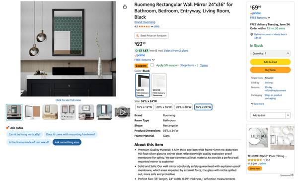Selling three brand-new, never-opened Ruomeng rectangular wall mirrors (24” x 36”). These are stylish, versatile pieces perfect for bathrooms, bedrooms, hallways, or entryways.
