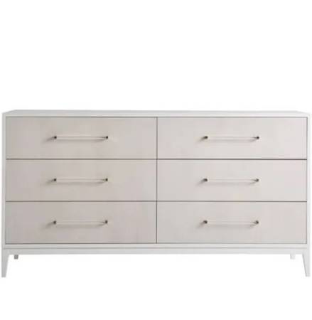A light and airy addition to any bedroom, the Brentwood Dresser features Alabaster finished drawer fronts with champagne and acrylic bar hardware, six spacious drawers, and a gleaming white lacquer case.