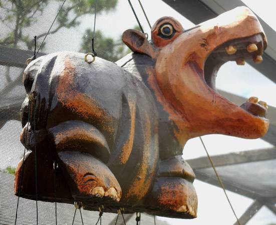 A solid, open mouth, wooden Hypo wind chime, colorful and hysterical! Solid, heavy hypo (9" x 11") with the sweetest safari wind chime sounds! 2 feet long. A unique winner! The white film you see on some of the photos is dust (maintenance at the zoo is poor)! Please click on my other listings - a link is on your right just under the Google Map.