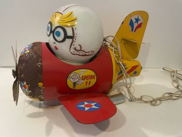 “SPEEDIE 11” HANGING USAF AIRPLANE LIFHT KENROY CO.,USA, 1960’s ALL METAL 14” LONG, 15” WIDE ART DECO STYLE ORIGINAL PILOT BULB LIGHT SOME RUST AND NEEDS TWO REAR LIGHTS AND AN ELECTRICAL PLUG....