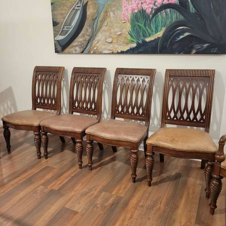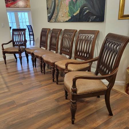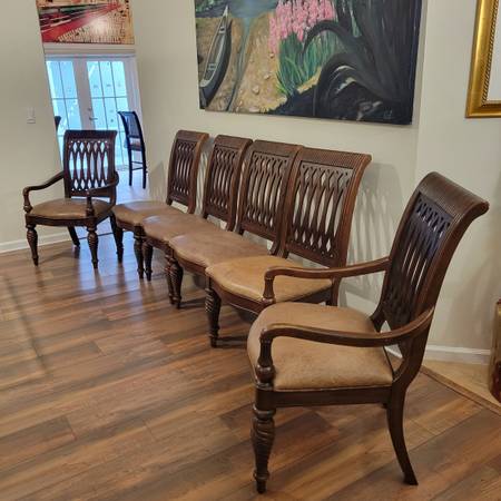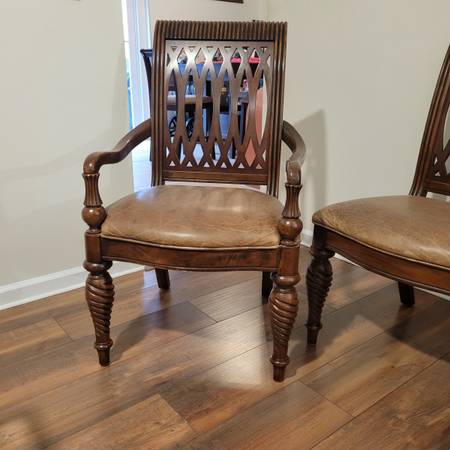 Beautiful solid wood genuine leather dining chairs from Bernhardt furniture 4 regular chairs and 2 Armchair High quality furniture Very good condition