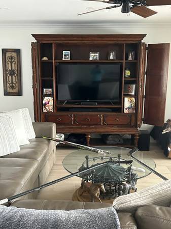 $ 1000 each Entertainment Center - 87" tall x 80" wide (TV Opening 33" tall x 52" wide) Lighted Credenza - 89" tall x 90" wide Very heavy furniture....you will need a mover for the entertainment...