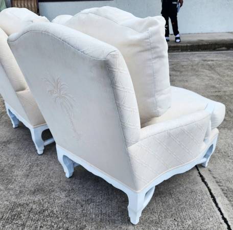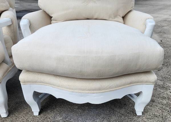 In good, structurally sound, and sturdy condition with no damage to the wood frames. There are a couple small faint stains on 1 cushion and some soiling on the back tops where there were mostly handled. Otherwise, very clean with no smells. The photos and video are an important part of the item description and condition so please use the zoom feature to view them closely.