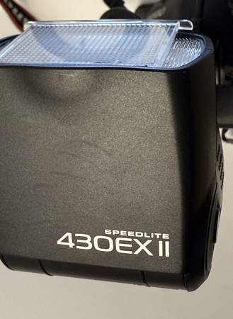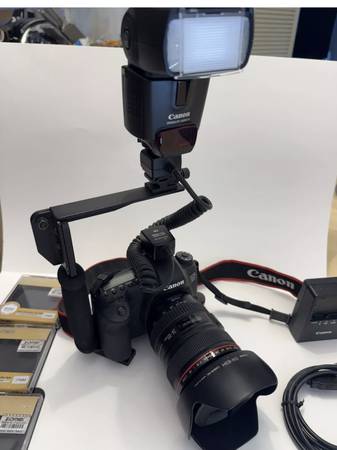 Includes Canon Speedlite 430EX Il flash, hand held bracket to mount the flash and camera for better handling. 3 special effects filters, 2 batteries, cable, battery charger, nice leather carrying case.